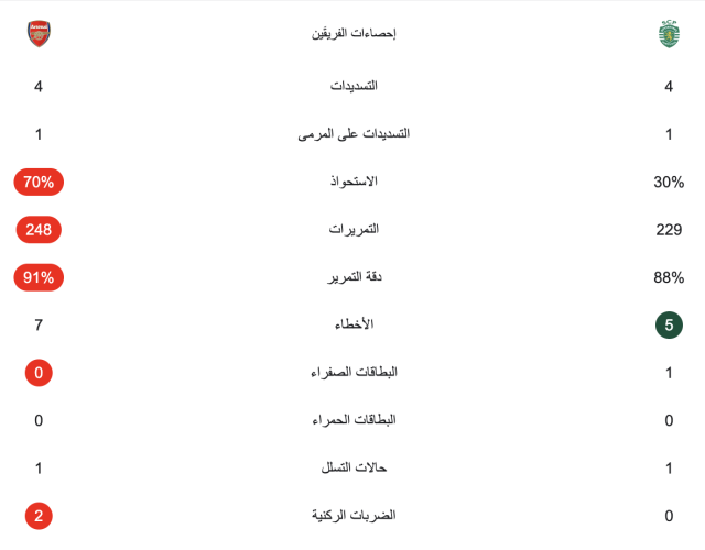 إحصائيات الشوط الأول لمباراة أرسنال وسبورتينغ لشبونة