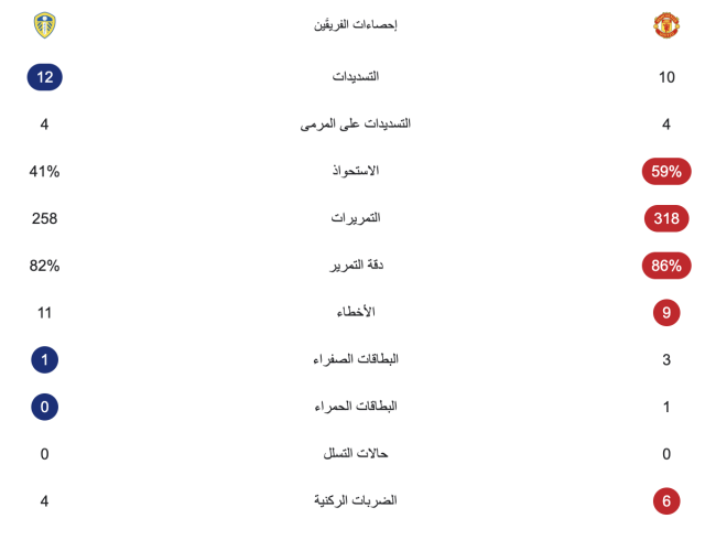 إحصائيات مباراة مانشستر يونايتد وليدز بعد مرور ساعة