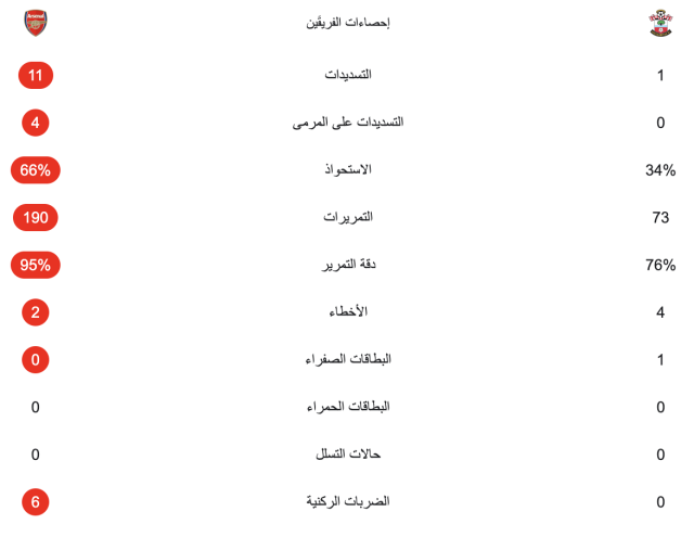 إحصائيات نصف ساعة من مباراة أرسنال وساوثهامبتون في كأس الاتحاد الإنجليزي