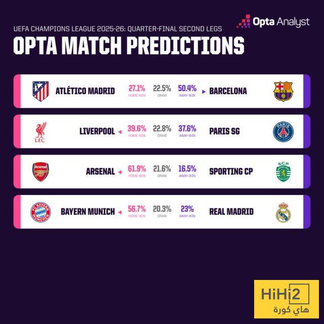 كشفت شبكة اوبتا المختصة عن توقعاتها بشان حظوظ الاندية الثمانية في الفوز بمباريات الاياب من الدور ربع النهائي لمسابقة دوري ابطال اوروبا .