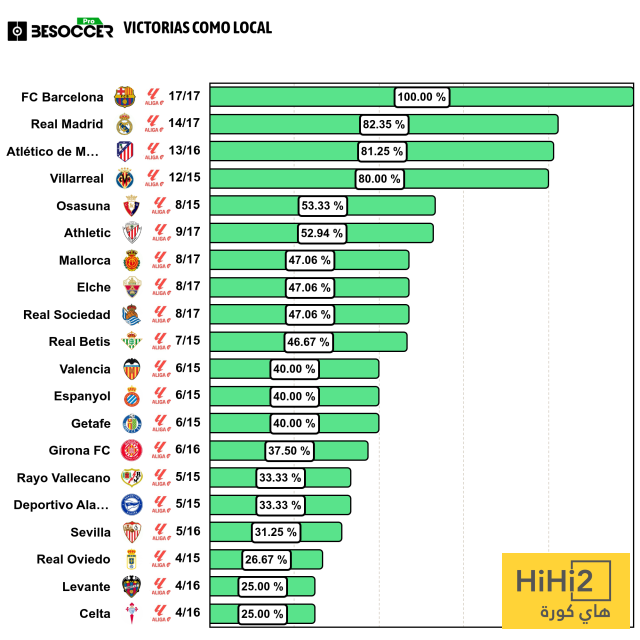 ووفقًا لصحيفة “موندو ديبورتيفو”، فإن الفريق الكتالوني بات على بعد مباراتين فقط على ملعبه أمام ريال بيتيس وريال مدريد، من تحقيق العلامة الكاملة على أرضه بالفوز في جميع مبارياته الـ19.