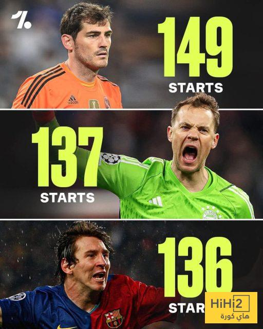 نجح الحارس الألماني مانويل نوير في تجاوز النجم الأرجنتيني ليونيل ميسي، بعدما وصل إلى 137 مباراة كأساسي في دوري أبطال أوروبا، مقابل 136 لميسي.