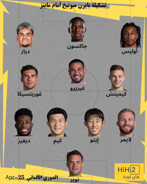 كشف موقع هاي كورة عن تشكيلة بايرن ميونخ المتوقعة ضد ماينز في الجولة الحادية والثلاثين من الدوري الألماني، والتي ستقام غدًا السبت وفق التوقيت المدرج لها على جداول الموقع لكل دولة في العالم.