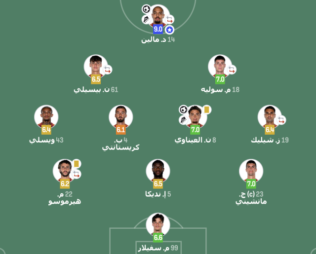 مالين قاد فريقه للانتصار من خلال تسجيل الهدف الأول وصناعة الهدف الثاني، ليكون صاحب التقييم الأعلى على موقع سوفا سكور العالمي.