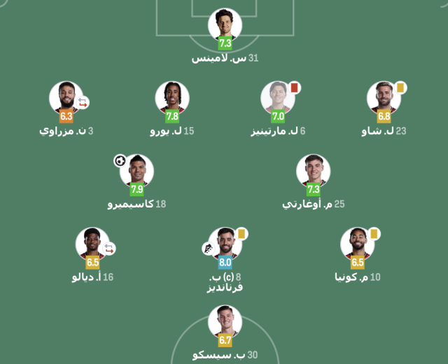 فيرنانديز صنع هدف اليونايتد الوحيد الذي تكفل كاسيميرو بتسجيله، لكن فريقه خسر بهدفين مقابل هدف، ومع ذلك حصل على تقييم مرتفع من موقع سوفا سكور بسبب أدائه في المباراة.