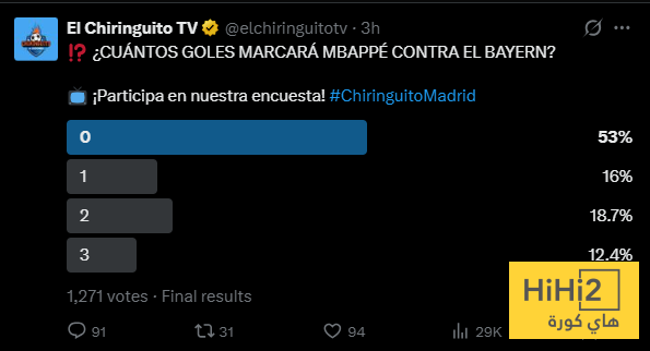 حسب استطلاع رأي اجراه برنامج التشيرينغيتو للسؤال عن : ” كم هدف متوقع من كيليان مبابي ضد الفريق البافاري ؟ ” كشفت النتائج عن خيبة أمل جماهير ريال مدريد في نجمها الاول ، فأكثر من نصف عدد المصوتين لا ينتظرون اي هدف من اللاعب الفرنسي ولا يتوقعون منه قيادة الفريق للفوز .