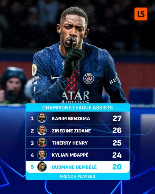 حيث أكد موقع لايف سكور أن صناعة ديمبيلي لهدف أمام بايرن ميونخ في مباراة الليلة، جعلته يصبح خامس أكثر لاعب فرنسي يصنع أهدافًا في تاريخ البطولة بواقع 20 تمريرة حاسمة.