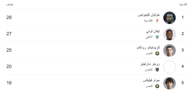 العالمي انتصر بهدفين دون رد، وسجل رونالدو الهدف الافتتاحي لفريقه، ليرفع رصيده من الأهداف إلى 25 هدف، ليقترب أكثر من صدارة ترتيب الهدافين التي يسيطر عليها خوليان كينيونيس مهاجم القادسية صاحب الـ28 هدف.