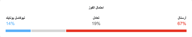 نسبة فوز أرسنال 67%، ونسبة فوز نيوكاسل يونايتد 14%، ونسبة التعادل 19%.