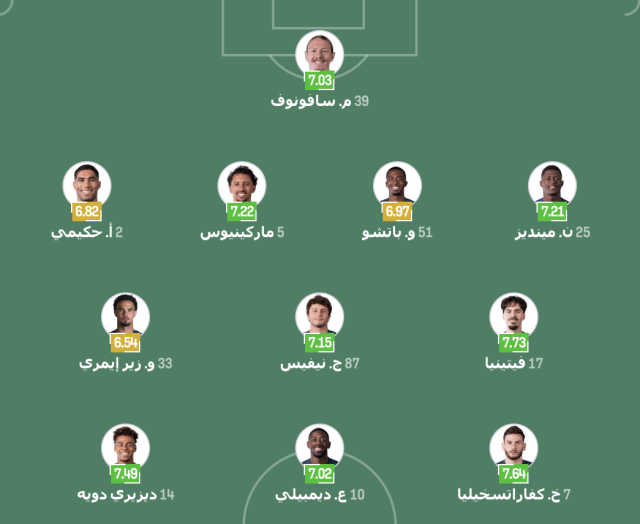 خط الدفاع: أشرف حكيمي – ماركينيوس – ويليان باتشو – نونو مينديز.