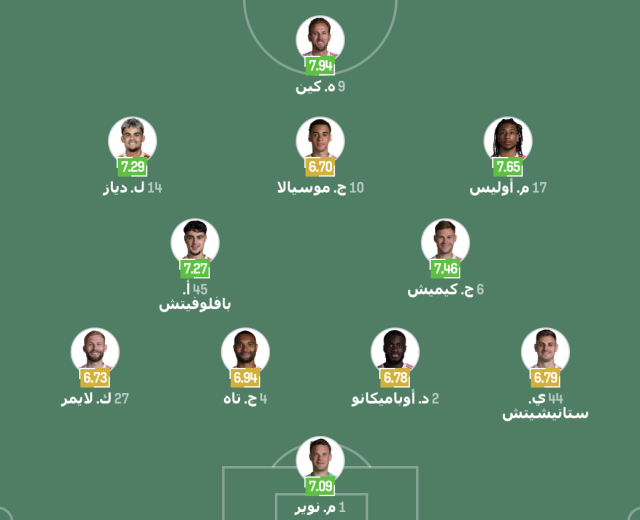 خط الوسط: جوشوا كيميتش – ألكساندر بافلوفيتش – مايكل أوليس – جمال موسيالا – لويس دياز.