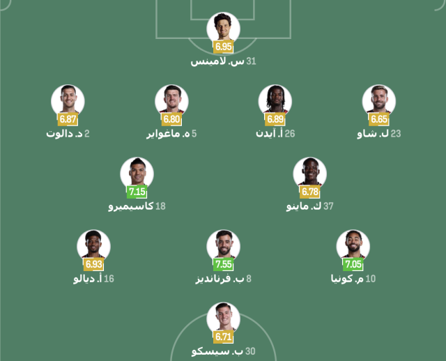 خط الوسط: كوبي ماينو – كاسيميرو – أماد ديالو – برونو فيرنانديز – ماتيوس كونيا.