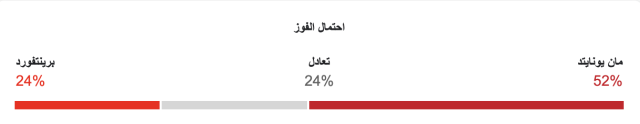 نسبة فوز مانشستر يونايتد 52%، ونسبة فوز برينتفورد 24%، ونسبة التعادل 24%.