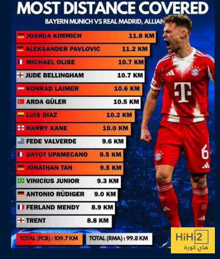 في إحصائية عن أكثر اللاعبين قطعا للمسافات في مباراة ريال مدريد وبايرن ميونخ بإياب ربع نهائي الأبطال ، ظهر المهاجم هاري كين في مركز متوسط ضمن القائمة رغم عمره ودوره الهجومي .