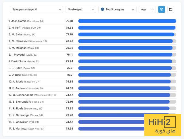 يتصدر خوان غارسيا قائمة حراس المرمى في الدوريات الأوروبية الخمسة الكبرى بنسبة تصديات بلغت 79.31%.