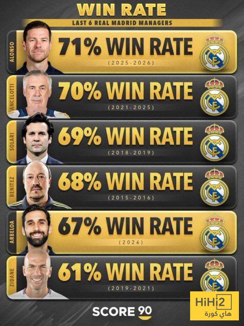 كشفت إحصائية صادرة مؤخرًا عن معدلات الفوز لآخر 6 مدربين تولوا قيادة ريال مدريد، حيث تصدر تشابي ألونسو القائمة بأفضل سجل نتائج مقارنة ببقية الأسماء.