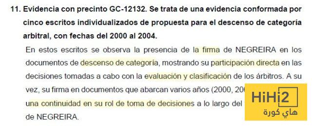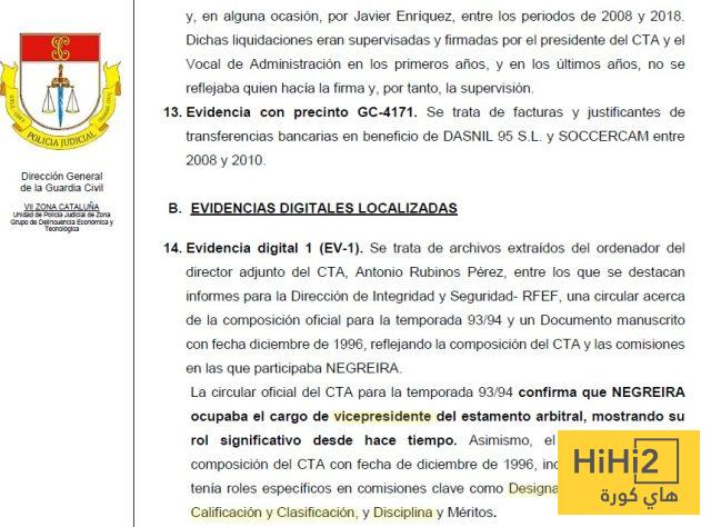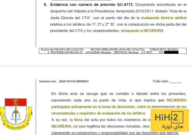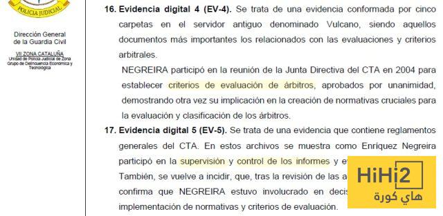 نشر موقع Fútbolgate.com جزء من الأدلة التي عثرت عليها الحرس المدني خلال التفتيش في الاتحاد الإسباني لكرة القدم ، والتي لم يتم الكشف عنها بعد من قبل الصحافة حيث تظهر مدى أهمية نيغريرا داخل المنظومة التحكيمية .