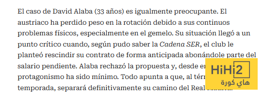 وفقا لإذاعة كادينا سير الاسبانية ، وصل وضع ديفيد ألابا مدافع ريال مدريد الى نقطة حرجة حيث عرض عليه النادي انهاء عقده مبكرا مع دفع جزء من راتبه المستحق .