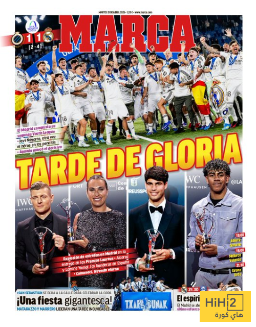 تصدر فوز ريال مدريد للشباب وتتويجه بلقب دوري ابطال اوروبا غلاف صحيفة ماركا الاسبانية الى جانب جوائز حفل لوريوس .