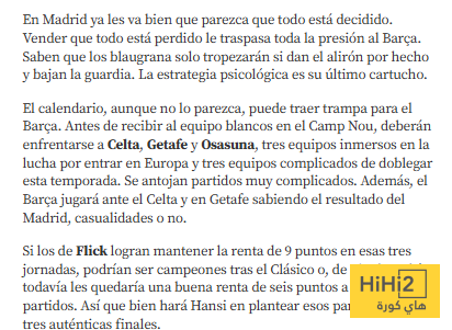إذا تمكن رجال فليك من الحفاظ على تقدمهم بتسع نقاط خلال هذه المباريات الثلاث فقد يتوجون أبطالاً بعد الكلاسيكو حتى لو تعثروا هناك ، سيظل لديهم تقدم مريح بست نقاط مع تبقي ثلاث مباريات لذا سيكون من الحكمة أن يتعامل هانز مع هذه المباريات وكأنها ثلاث نهائيات حقيقية .