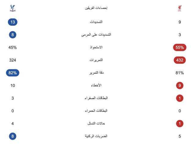 وبهذه النتيجة أصبح رصيد ليفربول 58 نقطة ليعود للمركز الرابع في جدول الترتيب العام، بينما توقف رصيد كريستال بالاس عند 43 نقطة في المركز الثالث عشر.