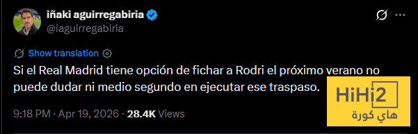 ” إذا أتيحت الفرصة لريال مدريد للتعاقد مع رودري الصيف المقبل ، فلا يمكنهم التردد ولو لثانية واحدة في إتمام هذه الصفقة ” .