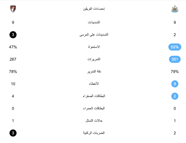 وبهذه النتيجة ارتفع رصيد بورنموث ليصبح 48 نقطة في المركز الثامن بجدول الترتيب العام، بينما توقف رصيد نيوكاسل عند 42 نقطة في المركز الرابع عشر.